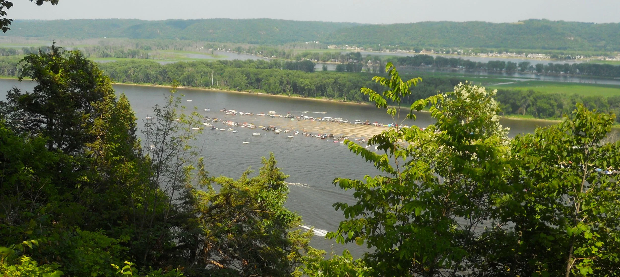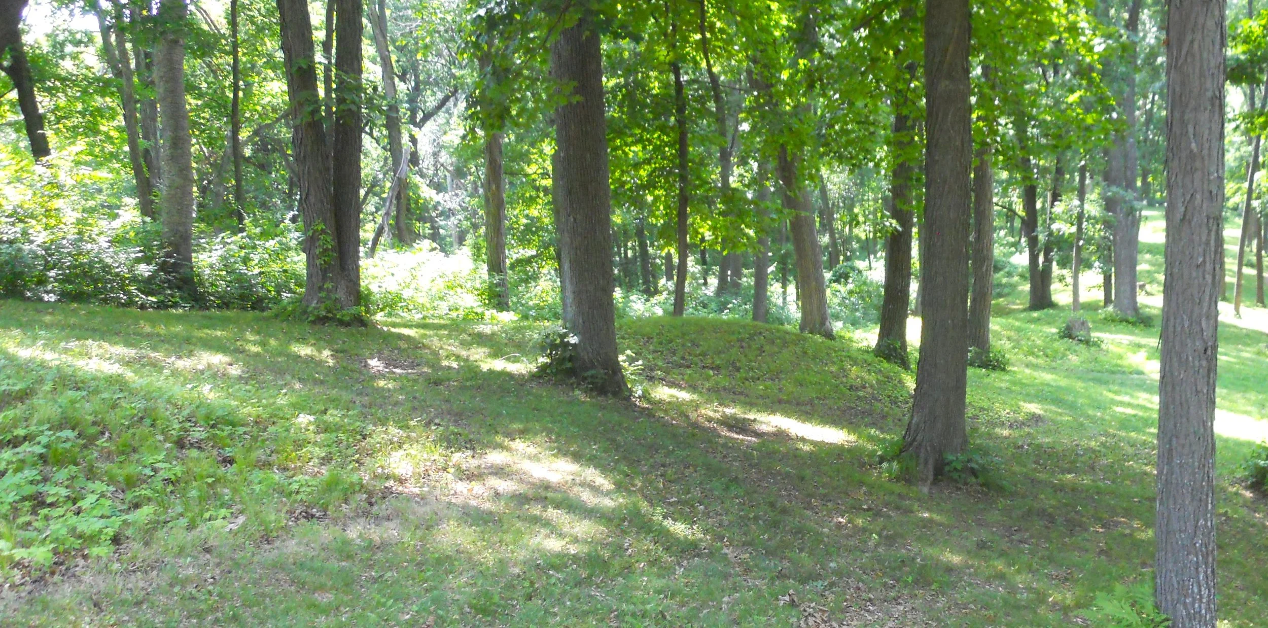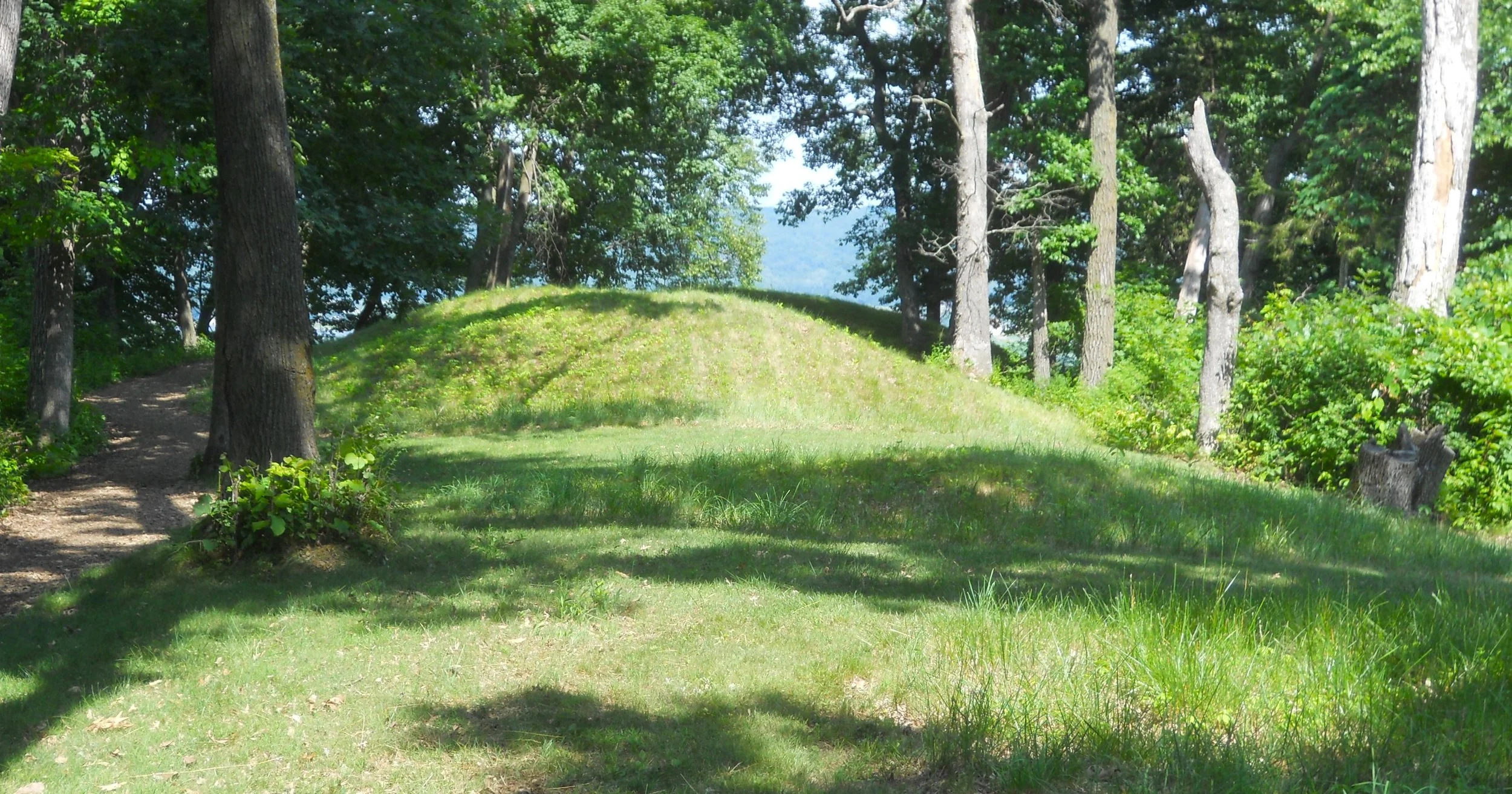Effigy Mounds NMon preserves over 200 mounds, which sit high above the Mississippi River. Twenty native tribes are connected to this site. The mounds were built between 1400 and 750 B.P. (means “before present). Conical mounds (photo tries to show four heading down a hill) were for burial purposes. One of the largest conical mounds is at Fire Point, which overlooks the river (today there were plenty of boats going up and down the Mississippi). Other mounds in the park are mainly in the form of a bear (Little Bear Mound is bottom right photo, but hard to make it out… the raised weeds and flowers comprise the shape… the head is at the top of the photo).