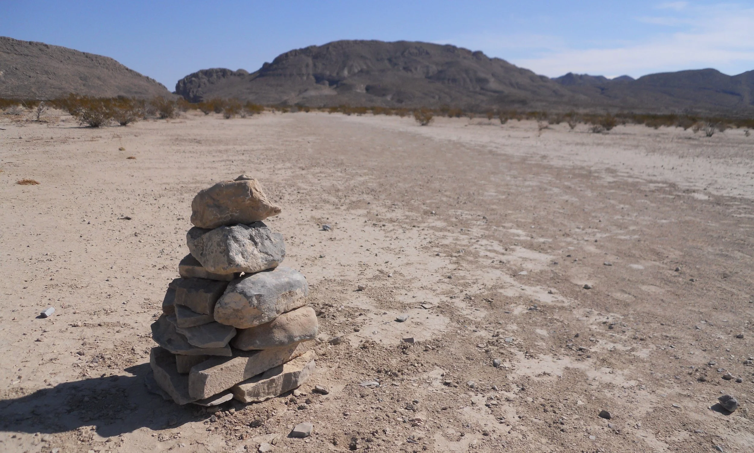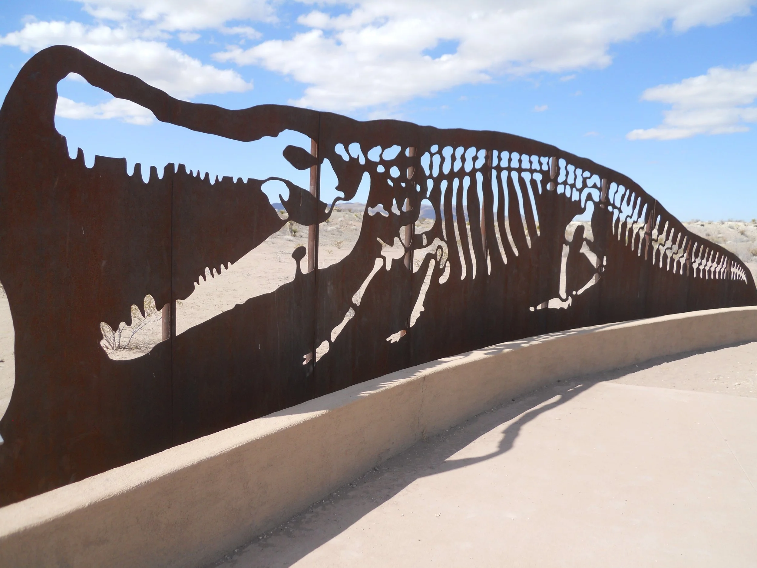Big Bend NP has a 4-mile RT hike to Dog Canyon. Legend has it that people came across a dog guarding an oxen wagon, but no owners in sight. The canyon was named for the dog. This rock cairn is two miles from the small “v” on the left side of the photo. Not the most hospitable place to get lost. But that was not the case 75 million years ago when the land was a swamp. The metal cut out is that of the largest crocodile (Deinosuchus) in this region. This species ate anything, including dinosaurs. Jaws would be in trouble.