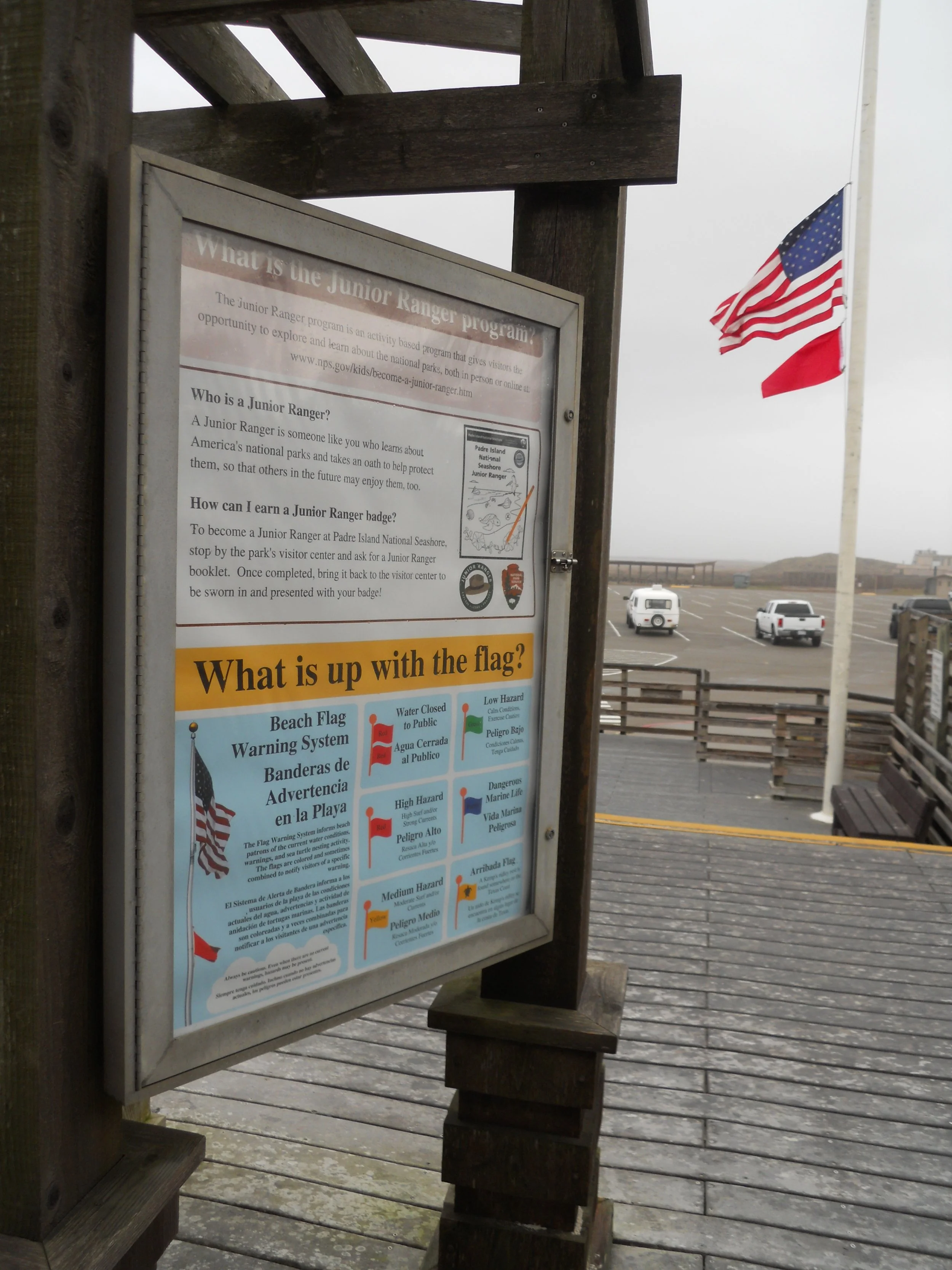 DAY 2 - The day began with a visit to Padres Island NS. Even a beach can have a miserable day, and January 24 was one of those. One red flag flying below the U.S. Flag (see photo) means high risk in the water. Winds were gusting to 40 mph. Waves were 5 feet. Cloudy, rainy, and no fun. Turns out the NPS showers were not open due to refurbishing, so even if one had ventured into the violent waters, no way to clean off. I did take the one-mile loop Nature Trial, and saw some Fire Wheel wildflowers (photo), as well as egrets and pelicans. Padres Island’s main fame in today’s world is being the number one spot for Kemp’s-Ridley turtle hatchings. In July and August, the public is invited to watch the NPS rangers release newly hatched turtles into the Gulf of Mexico. The rangers take eggs from nests after female turtles lay them, so as to protect the vulernable babies, to help the species recover.