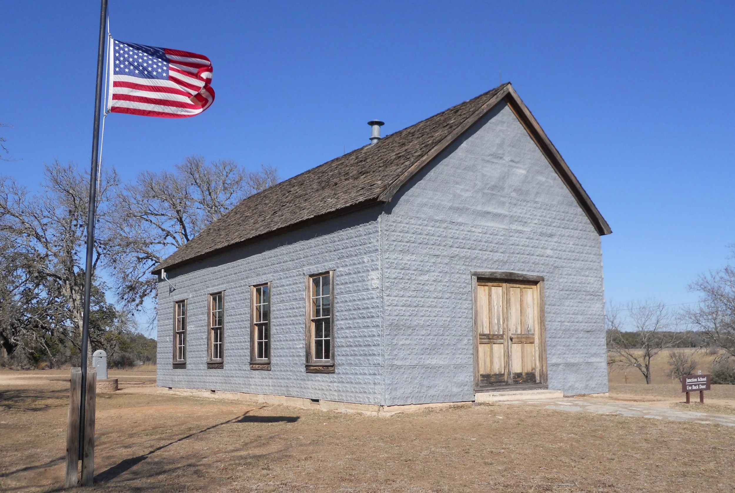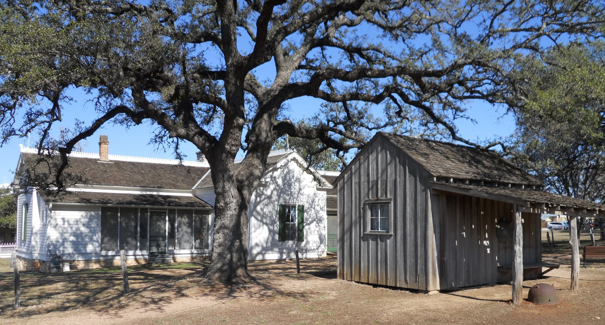 A drive north on US281 put me at Johnson City, where President Lyndon B. Johnson lived. One of his boyhood homes (photo with shed) is next to one Visitor Center. The other VC is at LBJ’s ranch, 15 miles to the west. You must obtain a pass from the Texas State Parks to drive the tour road around the ranch. The first building after crossing the Pedemales River is the one-room schoolhouse where LBJ began his schooling at the age of 4. One photo shows the inside of the building. During winter, the only heat was from a wood stove. Enduring hardships like that helped shape LBJ’s mindset which came in handy as President. He was 100% behind education, as well as Civil Rights for all Americans. The one photo shows the desk he sat in for 8th Grade. It is in a display box at the one VC.