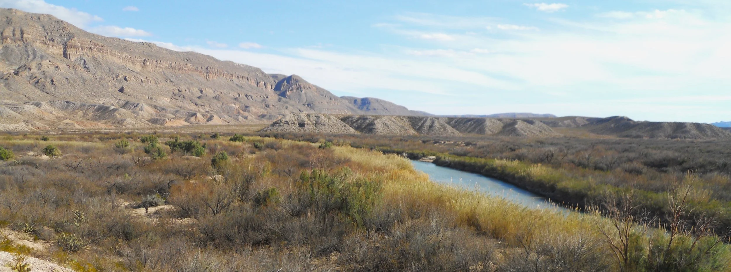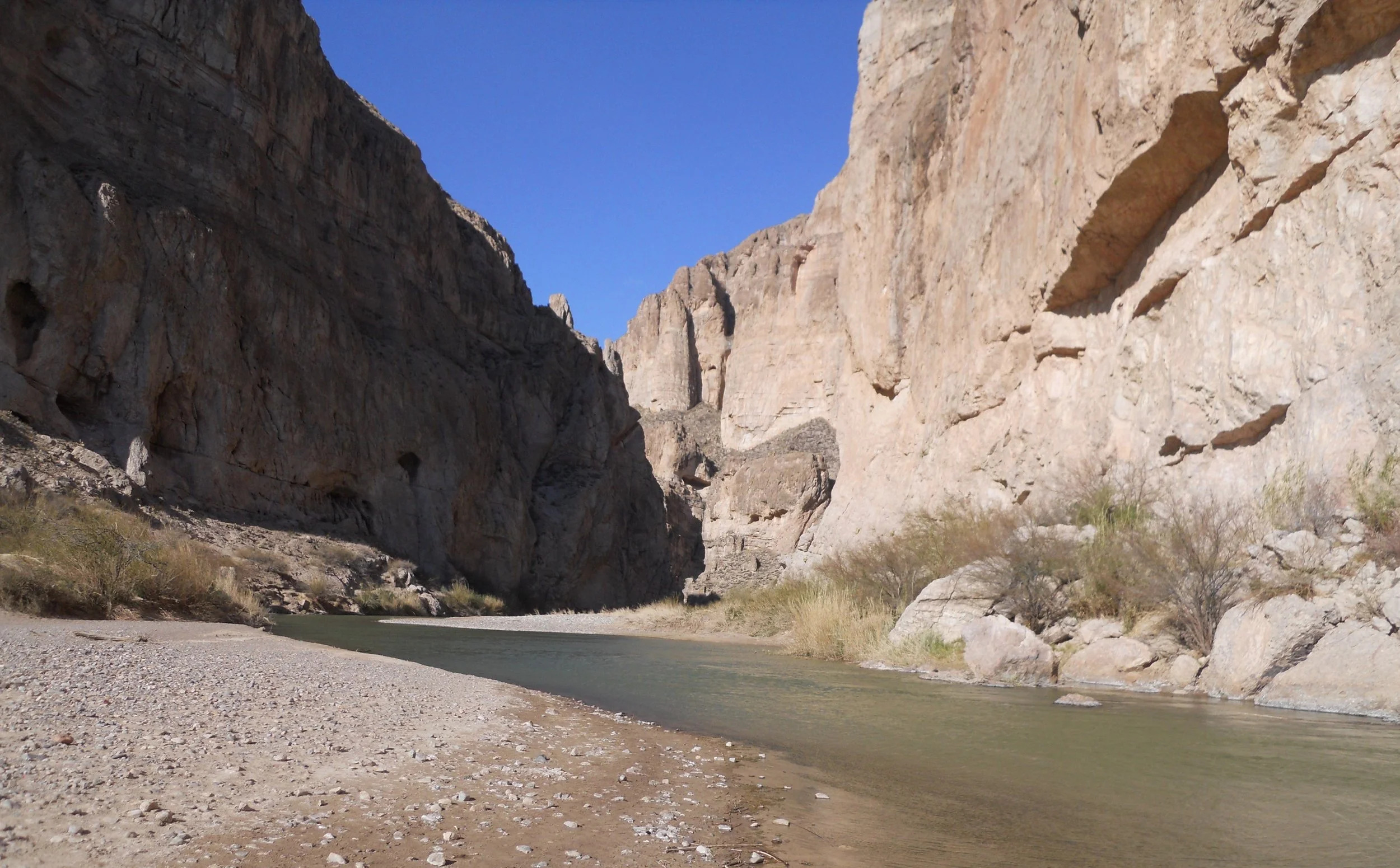 Then there is the Rio Grande, its own unit in the National Park System. The one photo shows the mountains stretching into Mexico, with the river cutting through the banks of brush and trees. The other photo is at the entrance to Boquillas Canyon. I threw a stone across the river, to hit a boulder in Mexico.