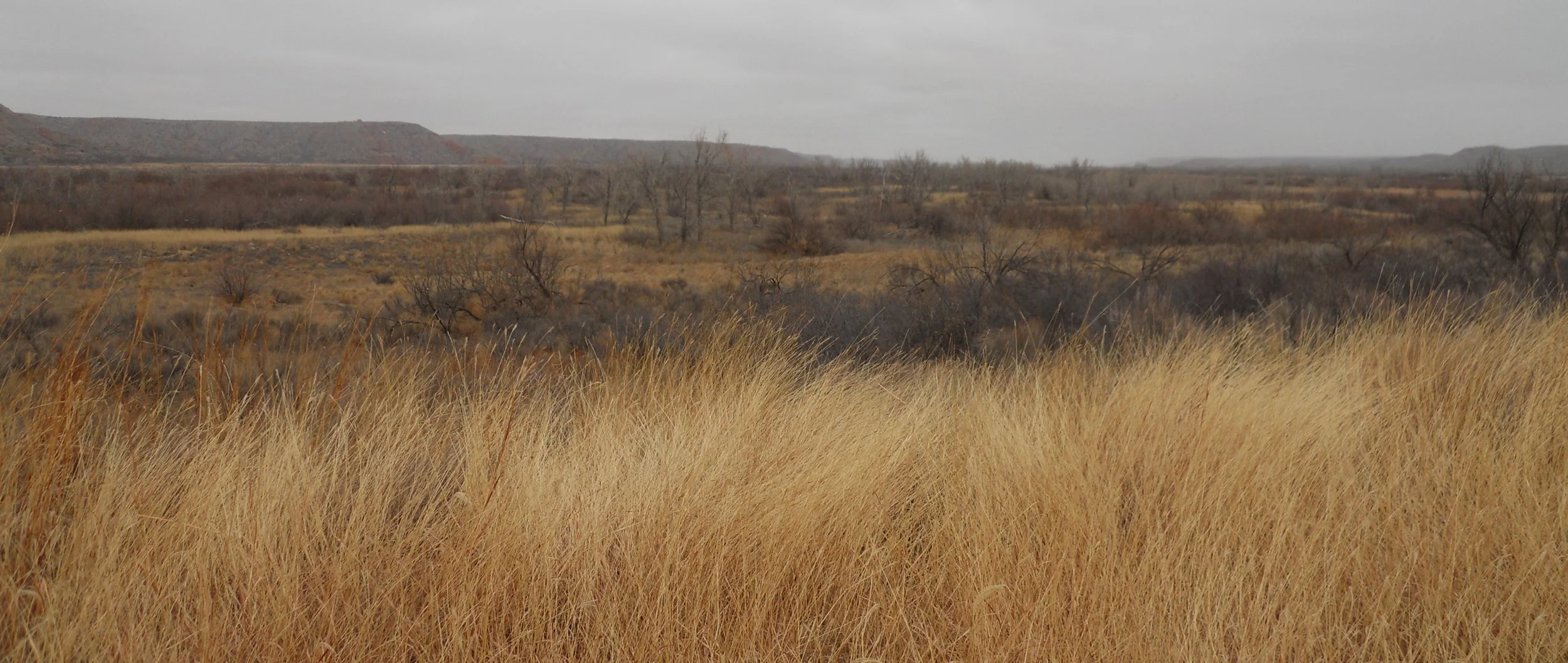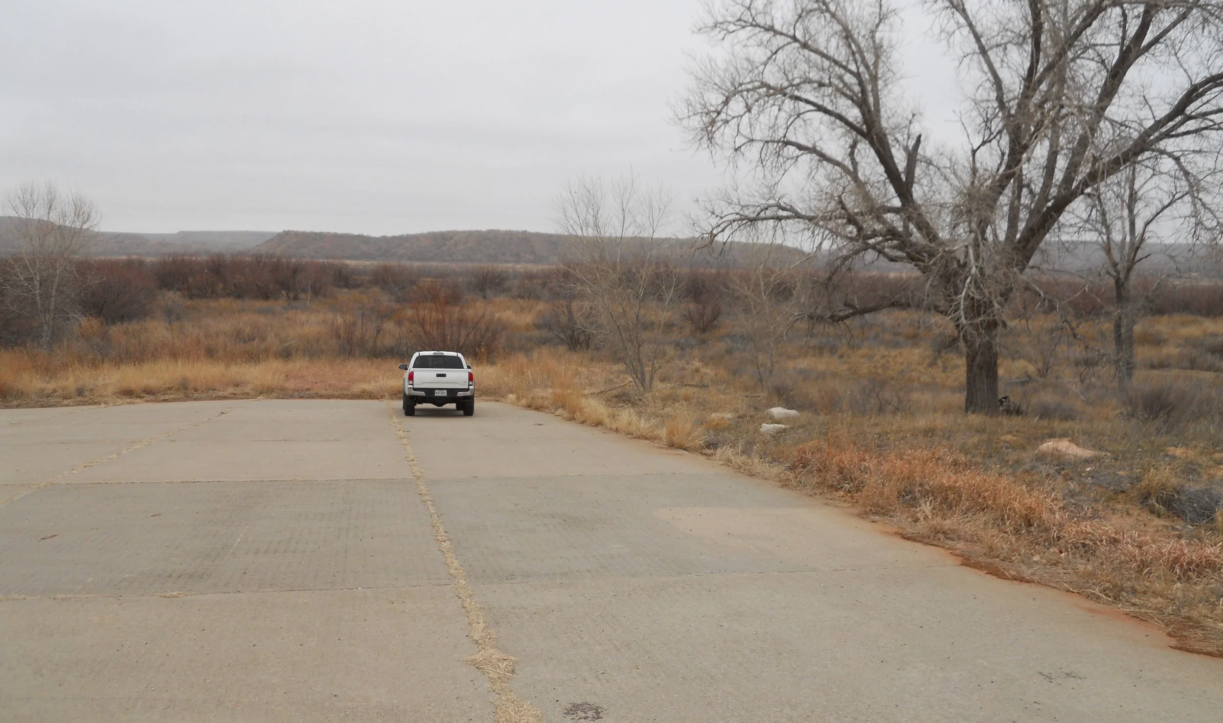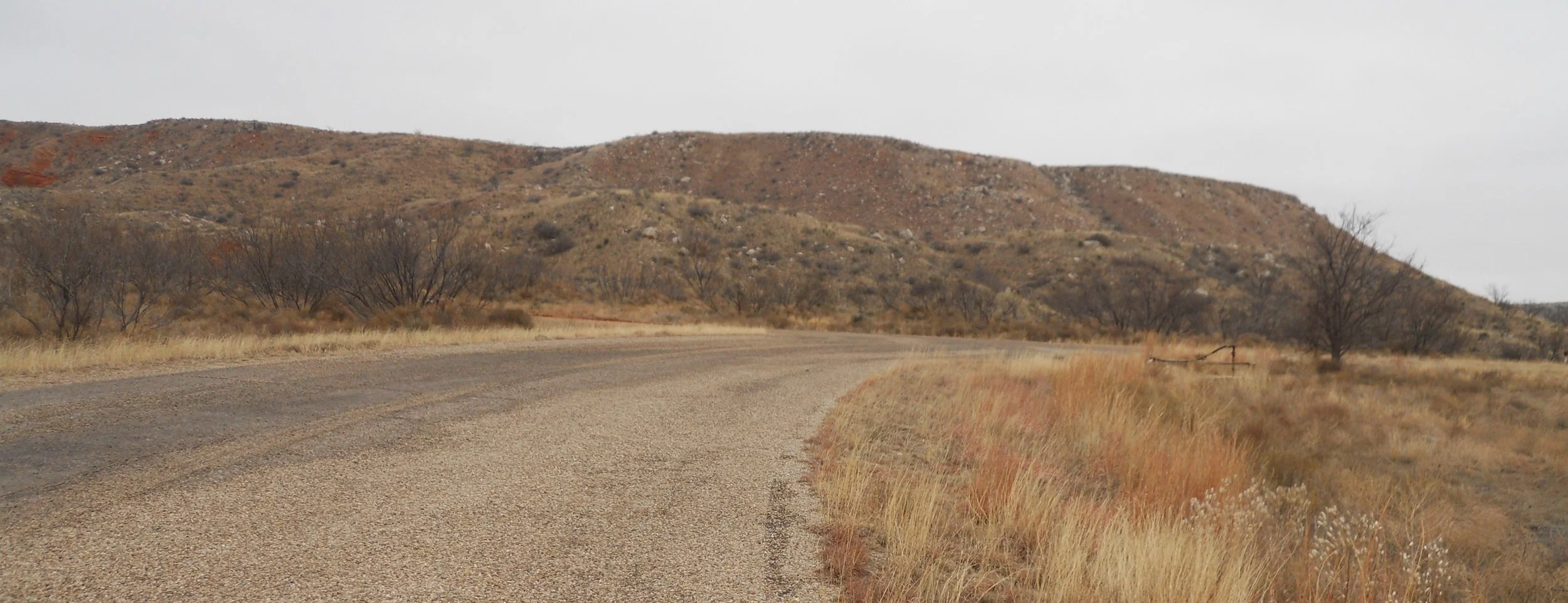 DAY 7 - 15F deg all the way from New Mexico to Alibates Flint Quarries NMon, and with blowing snow. This kept the rangers from having a tour of the quarries, but I still stepped inside the park boundary. The photo is of the tour road, just past the closed gate. Nearly 1,000 quarries have been identified in the park, many on top of mounds which you see in the photo.
