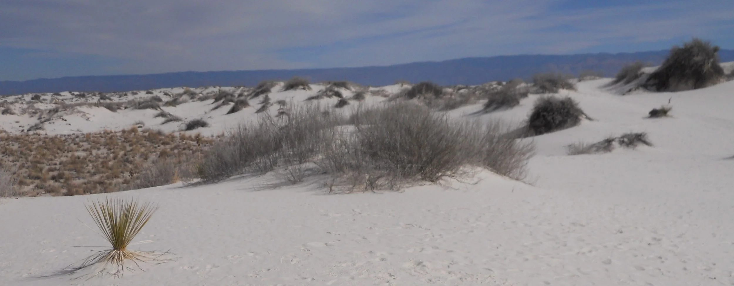 White Sands National Park sure looked white. That is right, not yellow or gold, but white. But, guess what? This is not really “sand”. Minute particles of gypsum make up this park. And gypsum is clear, not white. All those grains banging against each other, combined with reflecting sun light, makes for the appearance of white.