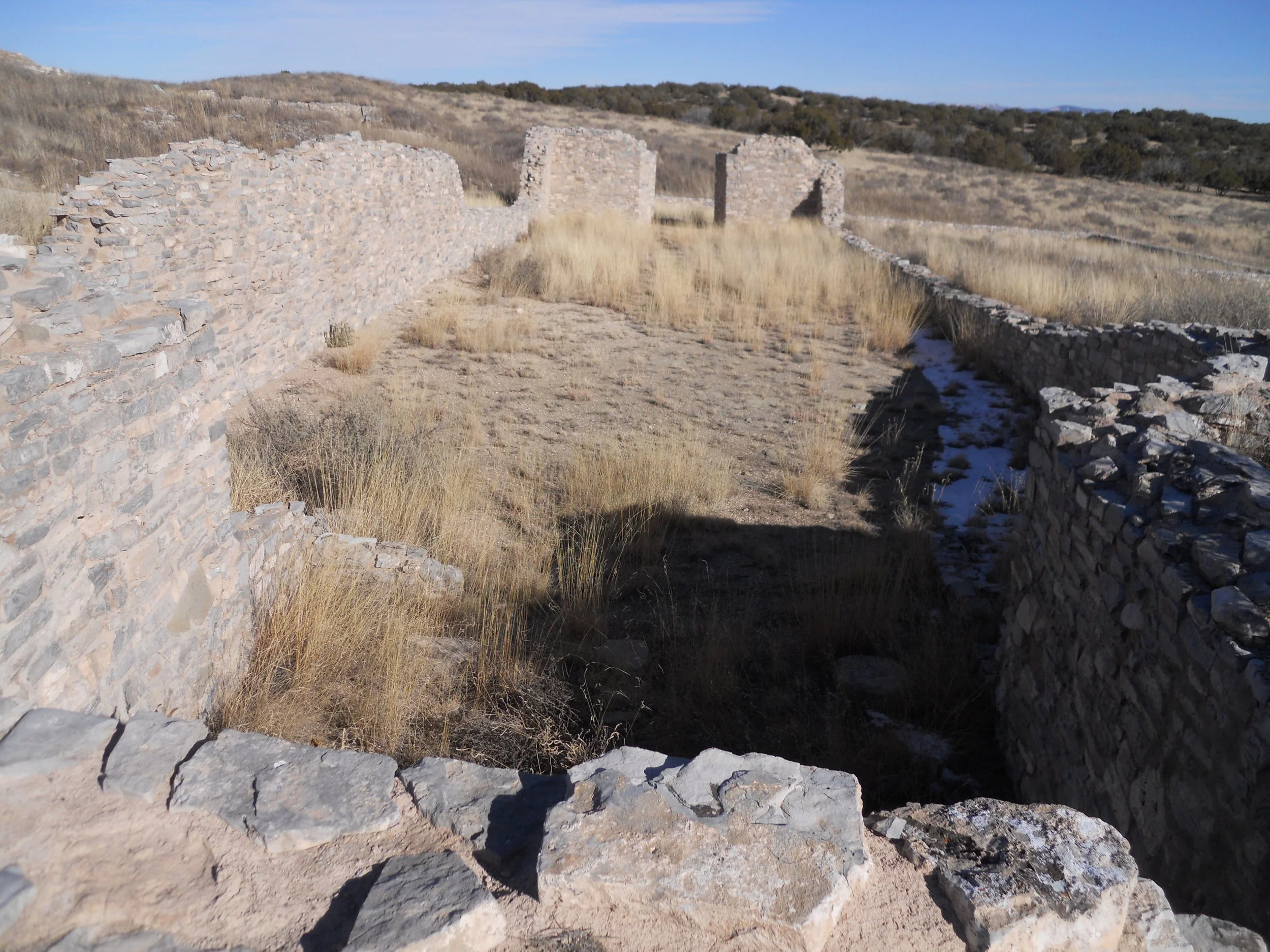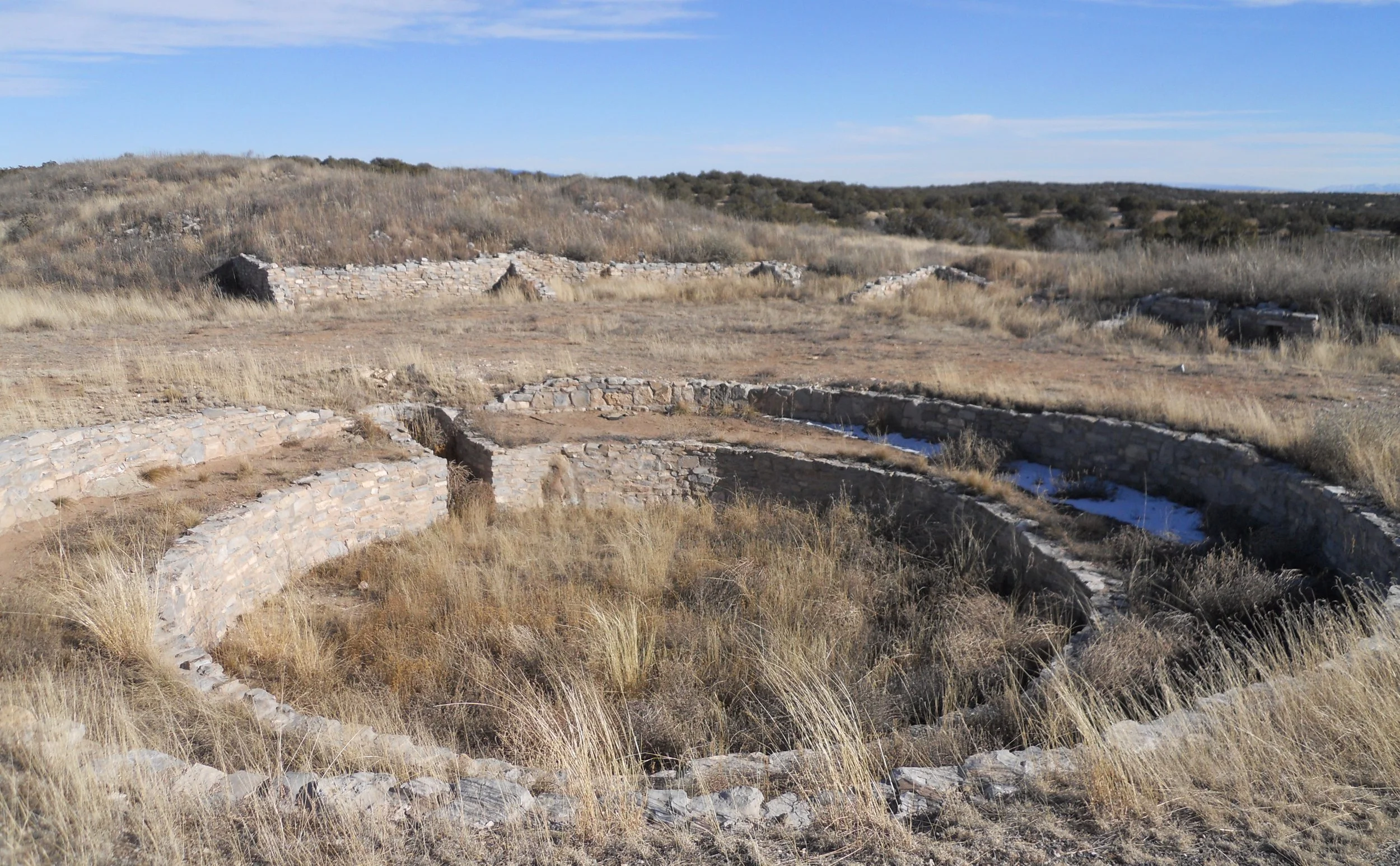 Salinas Pueblo Missions National Monument is a set of three ruins, spaced about 45 miles apart. If you can only make one of the units, consider Gran Quivira, the largest. The original 1630 church site is in the first photo. To its right is a view of the second church, looking up the hill. It is much more massive. A couple of kivas were present in the city (photo). The Franciscans for a time tolerated the local religious customs, with the native people building secret ritual sites within the complex. But after a few years they drove out all such practices.