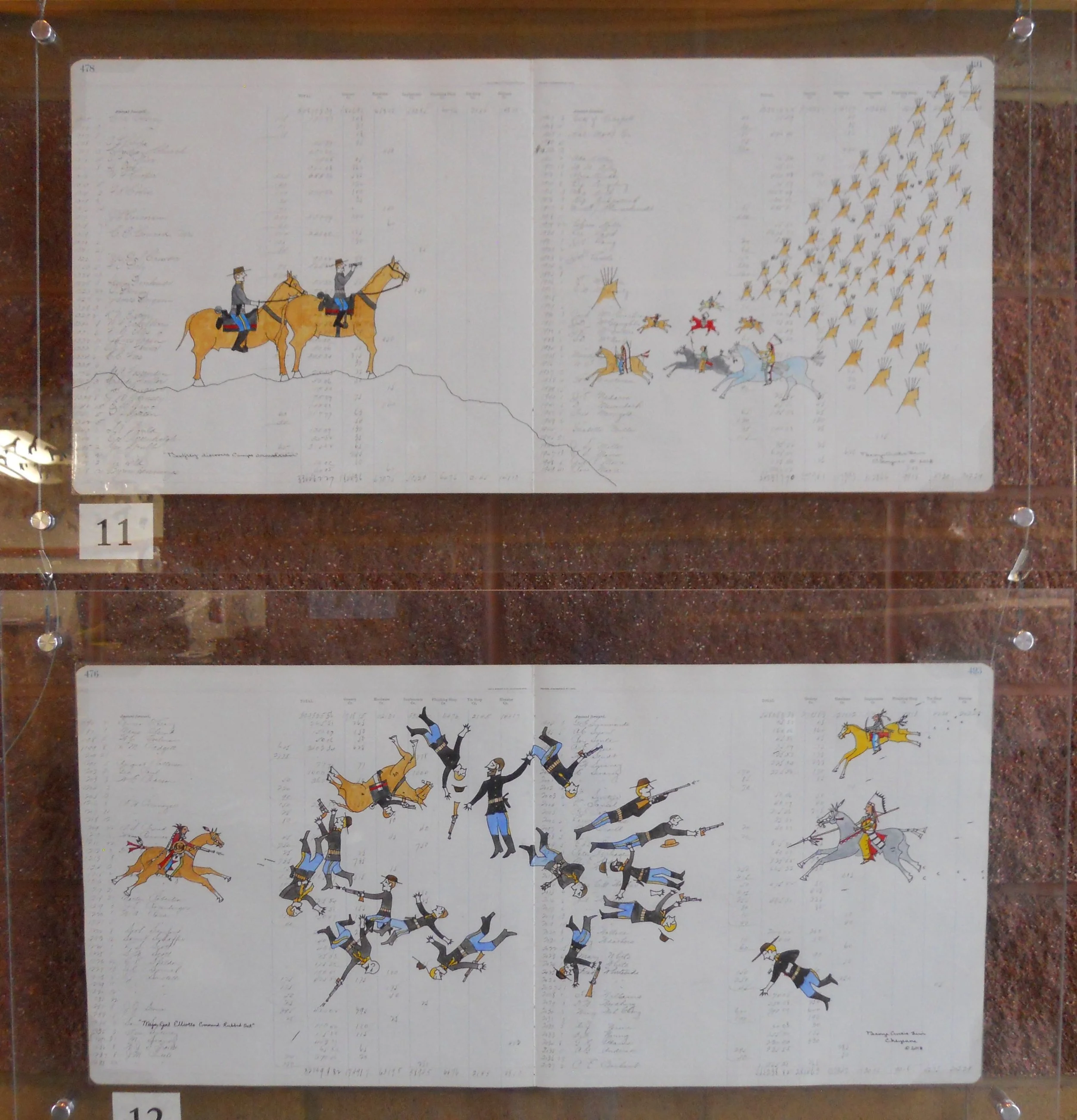 The art is by George Levi, in the method of Plains Indians via their ledger books.