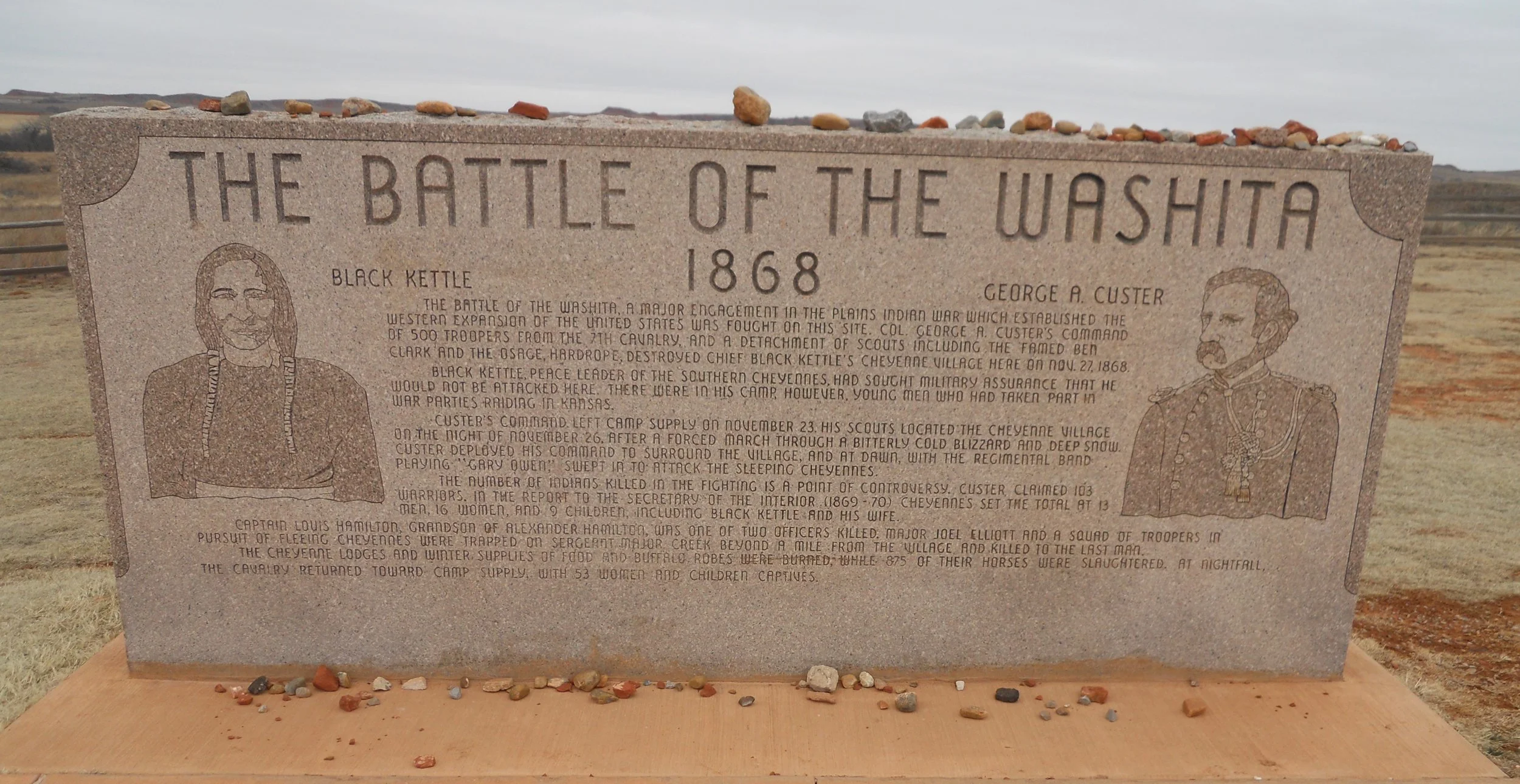 Washita NB involved Chief Black Kettle and Col. George Custer (yes, that Custer). The 7th Cavalry ambushed a Southern Cheyenne camp on the Washita River at daybreak, on November 27, 1868. After the victory, a Cheyenne Chief told Custer that since he and the U.S. Government had broken their peace promises to the tribe, death would befall Custer at the hands of native peoples. How prophetic, since in 1876 Custer was killed at the Battle of the Little Big Horn. People leave ribbons at the battlefield in memory of those massacred.